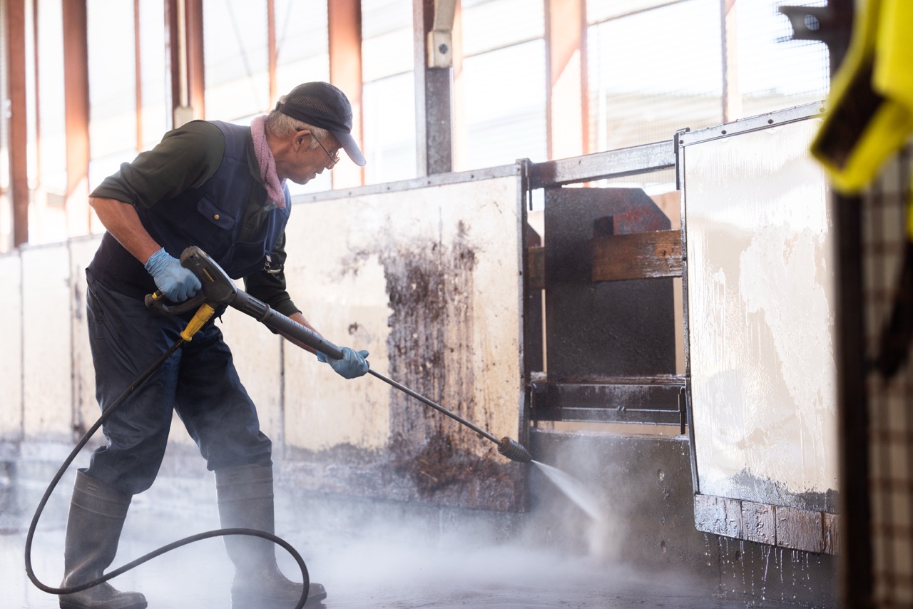 特に小さな仔牛たちの寝床については、床替え後には必ず高圧洗浄機による洗浄を実施しており、仔牛たちは常に清潔な環境で生活しています。